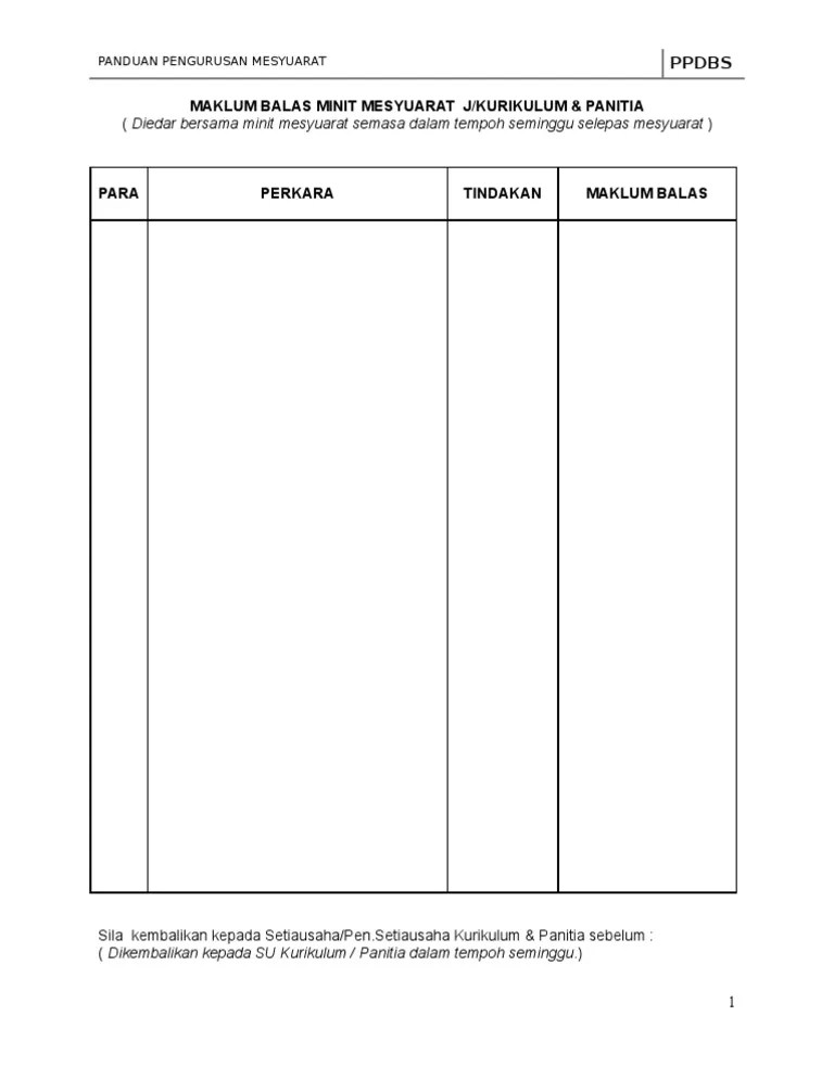 Format borang maklum balas minit mesyuarat. View flipping ebook version of maklum balas minit mesyuarat bil. Cik thong mee min meminta para guru guru kelas semua guru kelas telah . Rekod edaran minit mesyuarat e.r. Maklum balas perlaksanaan keputusan mesyuarat mesyuarat majlis permuafakatan pengarah kv, . Contoh maklum balas minit mesyuarat para perkara tindakan muka surat maklum balas minit mesyuarat nama mesyuarat : Muka para perkara tindakan maklum balas surat. Belum menyerahkan surat panggilan dan minit mesyuarat panitia .